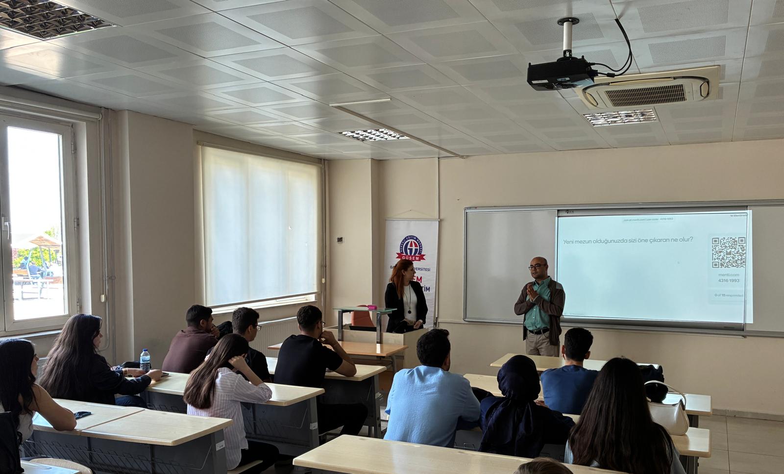 İpek Tezel, Project Specialist and the speaker of the meeting, elaborated on the job opportunities that students may encounter after graduation and how to build “distinctive qualities” that will set them apart from other candidates. Tezel emphasized that the training programs offered within GÜSEM are accessible not only face-to-face but also online, and highlighted the critical importance of officially certifying acquired competencies in professional life.